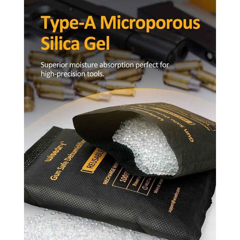 • ✅ [ Microporous Type-A Silica Gel ] Specially engineered for guns and high-precision equipment, the dehumidifier for gun safe features Type-A silica gel with a larger microporous surface for superior moisture absorption and humidity control.