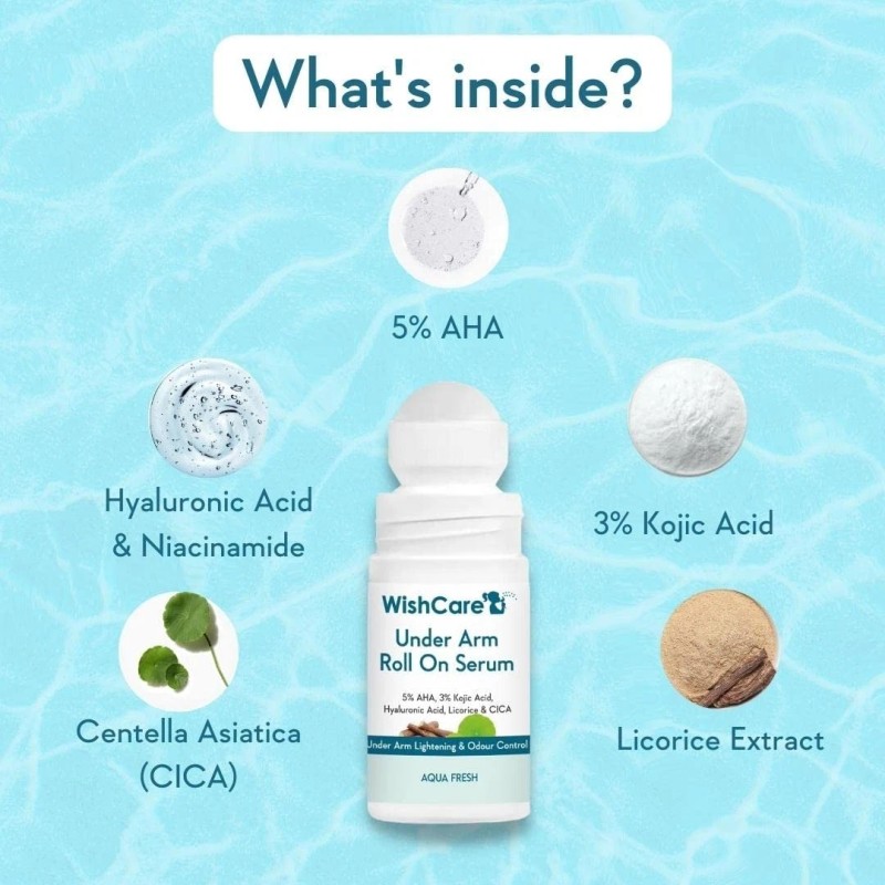 WishCare Under Arm Roll On Serum is a potent blend of AHA, Kojic Acid and Licorice.