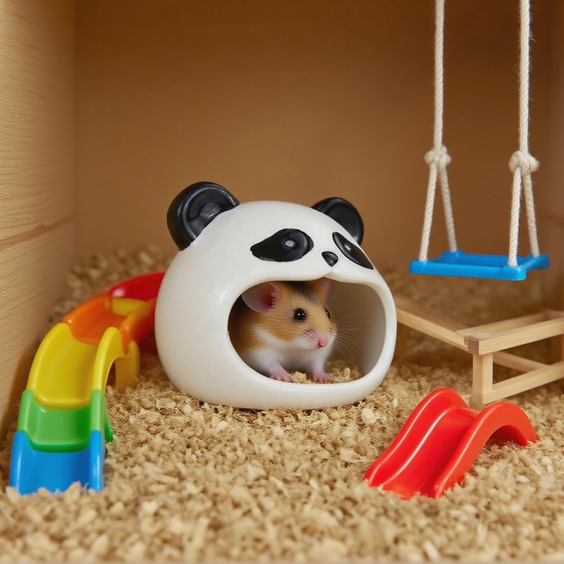 - Panda Decor: Our hamster hideout is themed with Panda, inventive and lovely, brings you a unique visual enjoyment. It allows hamsters to move, play, and rest freely, fully releasing their nature