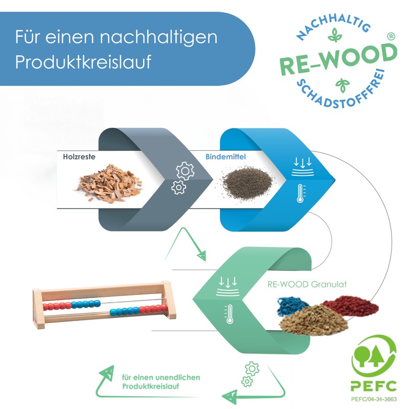 - Made from RE Wood: 100% recyclable, certified with the PEFC seal and free from harmful substances; meets the toy standard DIN EN 71 3
