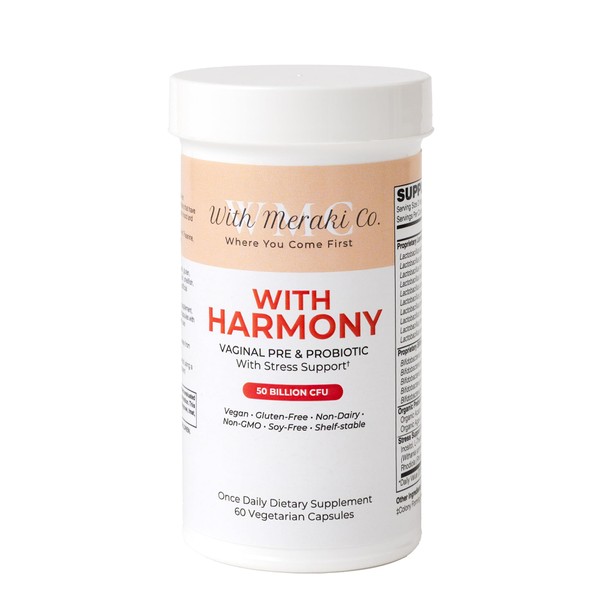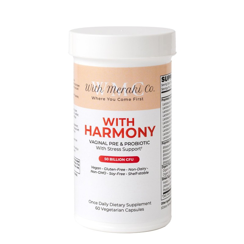 Discover With Meraki Co.'s With Harmony Vaginal Probiotic, a comprehensive wellness solution featuring 50 billion CFUs from 15 beneficial bacterial strains. This unique formula combines powerful probiotics with organic prebiotics including pea starch powder, acacia, and agave inulin to support optimal vaginal pH and microflora balance. The innovative blend includes targeted ingredients that work together to support hormonal balance and stress response, particularly beneficial during life changes such as menopause and postpartum periods. The shelf-stable formula features Bio-Enhanced Acid Resistant Strains (BEARS) technology, ensuring the probiotics survive the digestive journey. Free from common allergens including dairy, gluten, soy, and artificial additives, this vegan, non-GMO supplement incorporates synbiotic properties to maximize the growth of beneficial bacteria. The thoughtfully crafted formula helps maintain vaginal wellness while supporting mood balance and emotional well-being through enhanced gut-brain communication.