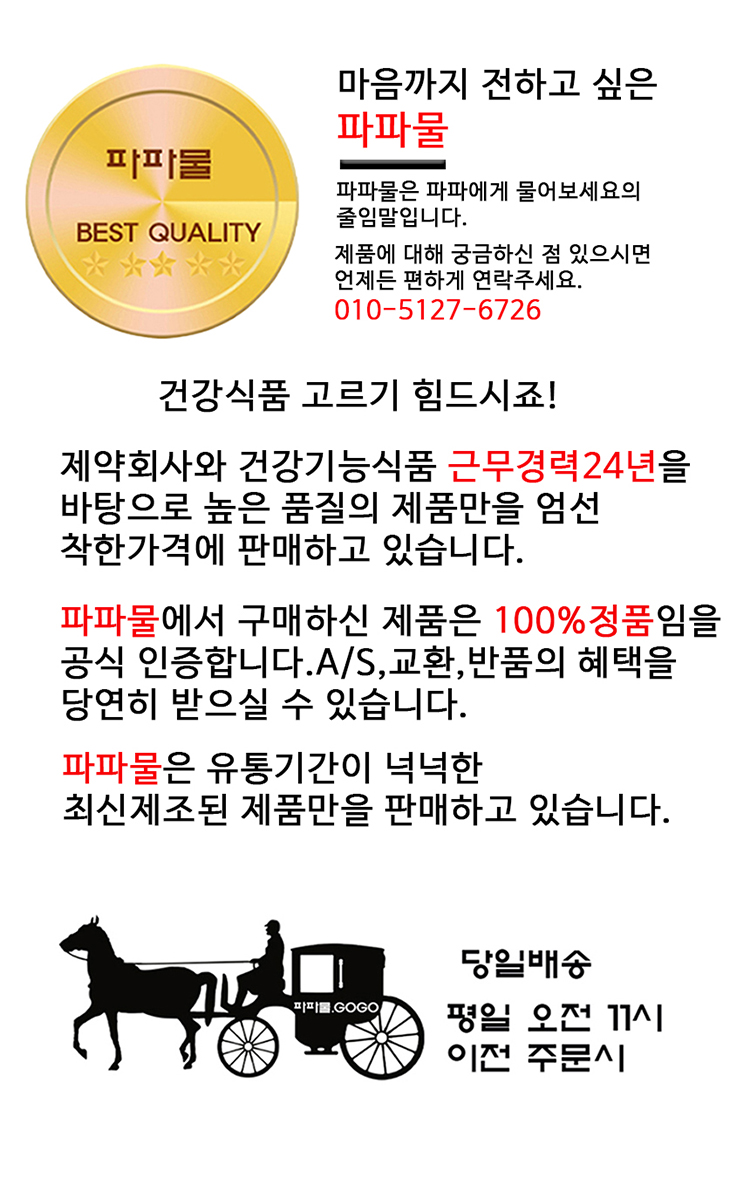 - 제조연월일, 소비기한 또는 품질유지기한: 예시) 수시 입출고 상품으로 각 상품마다 사용기한 또는 개봉 후 사용기간이 상이합니다. 귀하께 발송될 상품의 정확한 사용기한 또는 개봉 후 사용기간을 확인하시려면 소비자상담연락처로 문의 바랍니다.