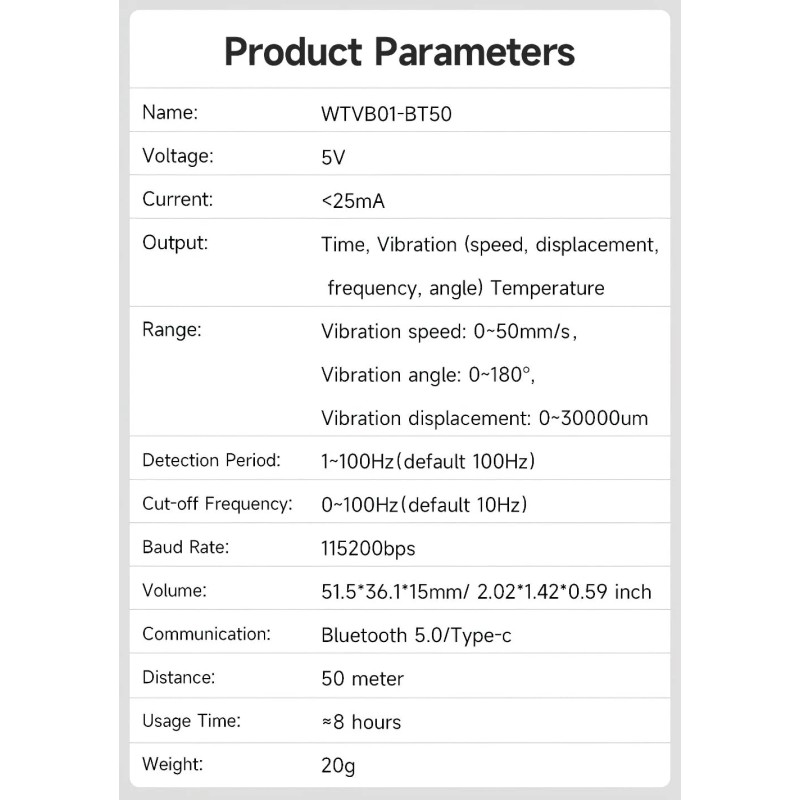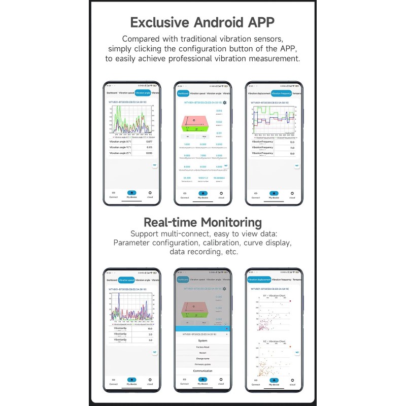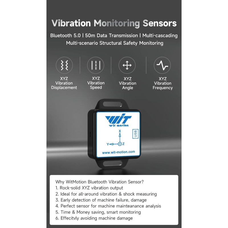b.WTVB01-BT50 is a solution for mechanical bearing vibration measurement and real-time monitoring. It can output three-axis displacement, three-axis speed, three-axis angle and three-axis frequency.
