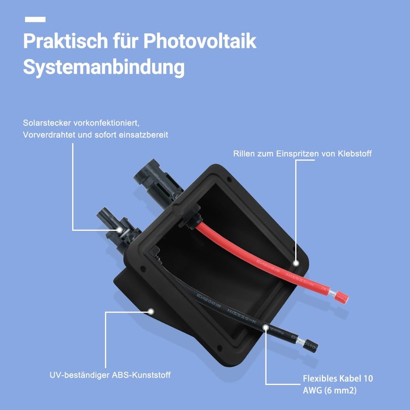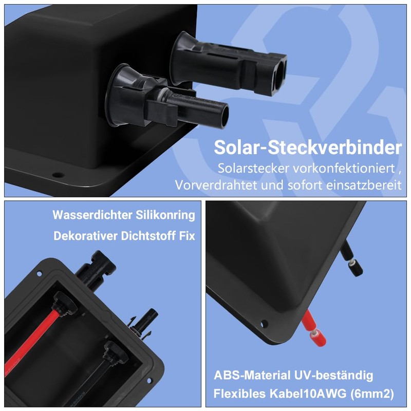 - Improved design: solar panel connectors are pre-assembled with 0.33 ft 10 awg wire, save a pair of waterproof glands, meanwhile, accelerate installation. Built-in screw slot for easy installation to prevent screws from slipping. There is a groove on the bottom, which is convenient for gluing, and improves the strength and waterproofing of the paste.