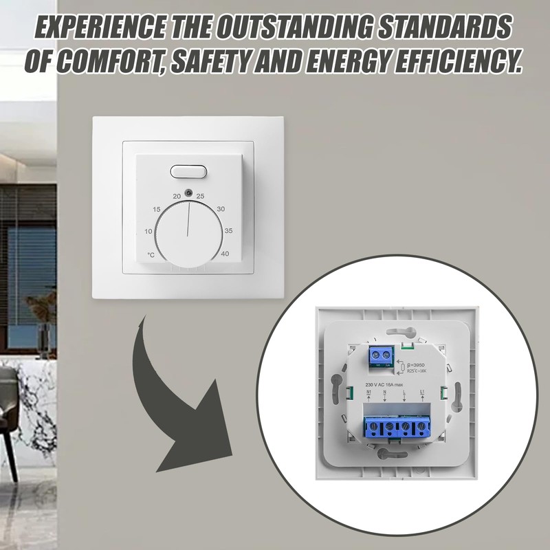 - Safe and durable: made of high-quality materials, the room thermostat offers underfloor heating a high level of safety and durability. It is designed to function reliably even with frequent use for many years. The robust construction and reliable safety features protect against overheating and ensure safe operation in your home.