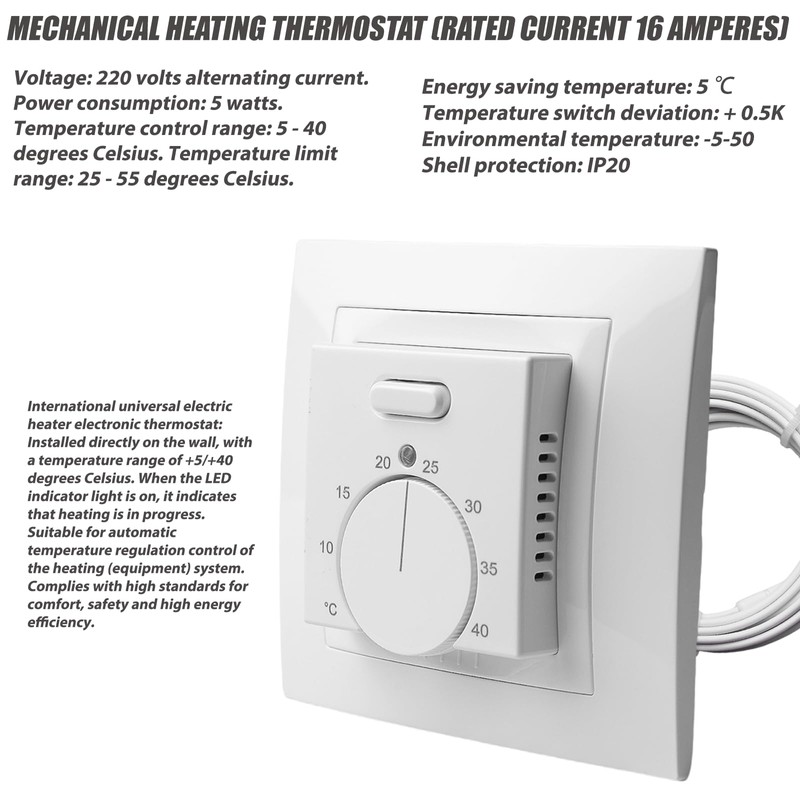 1. The standard 220V 16A room thermostat underfloor heating provides reliable automatic control of room temperature. This feature allows constant and comfortable heat as the thermostat actively regulates the heating system to maintain the desired temperature.