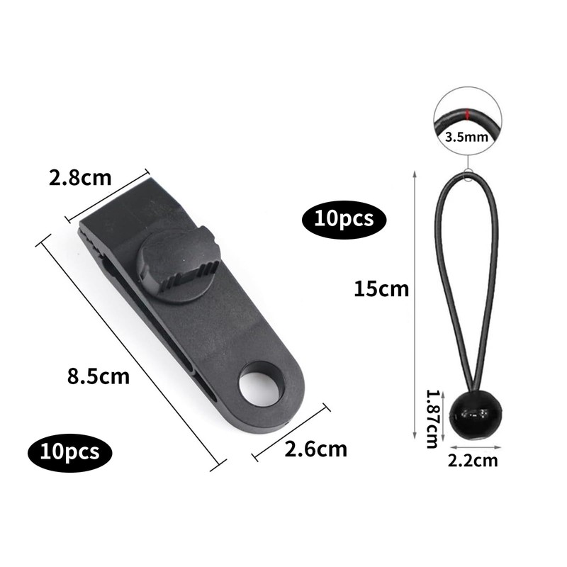 - 【Complete Set for Convenience】The set includes 10 tarpaulin clips and 10 elastic bungee cords, making it an all-in-one solution for securing your tarps, tents, and canopies. It’s ideal for a variety of outdoor applications