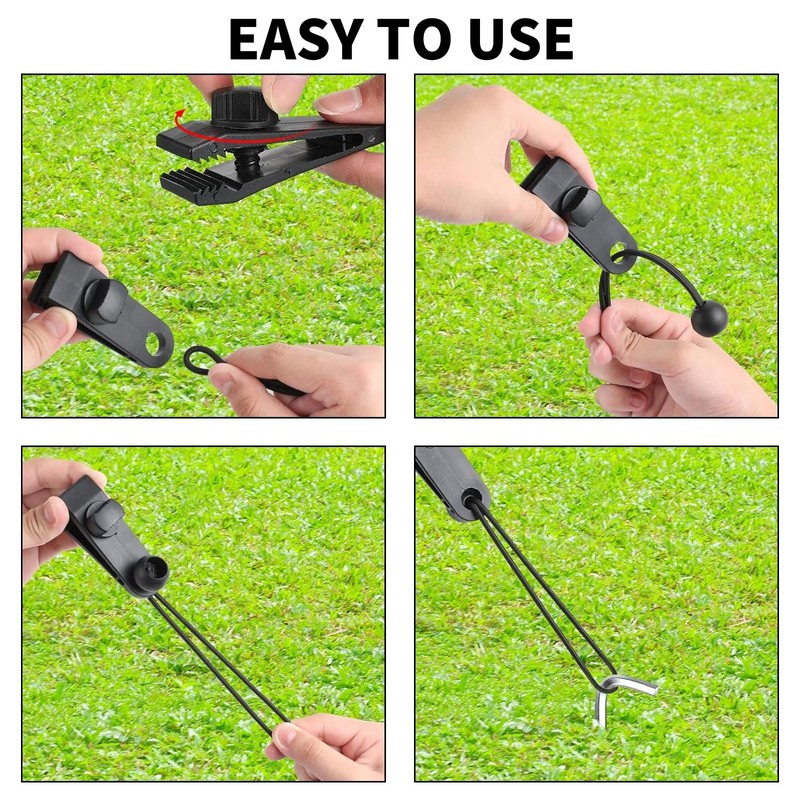 - 【Effortless Setup and Use】These tarp clips clamps are designed for easy installation. Simply clip onto your tarp, then secure with the bungee cord. The adjustable clips provide a quick, secure solution