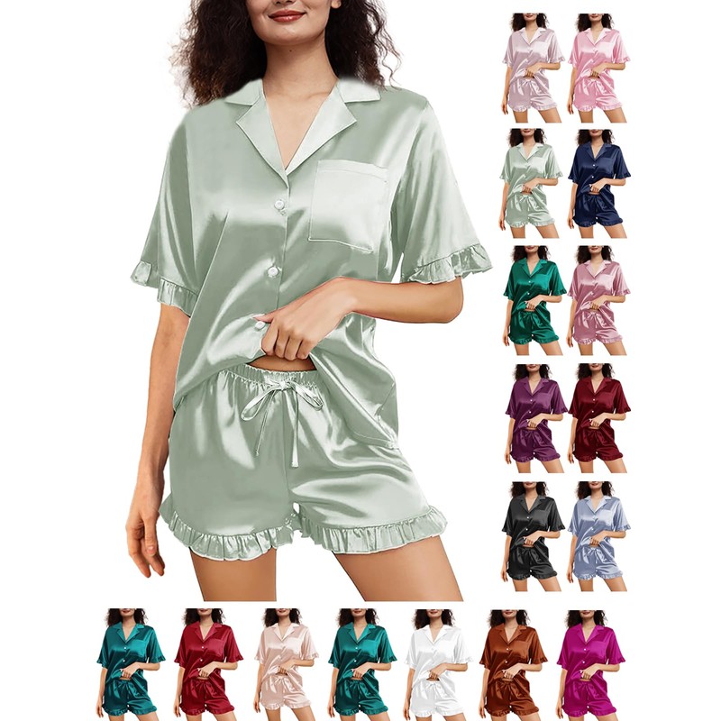 - PREMIUM QUALITY MATERIAL: Ruffle silk pajama short sets made of premium high-quality silky satin fabric which is super lightweight, soft and breathable, with ultra silky-smooth hand feeling. Makes you sleeping and leisure as comfortable as possible.