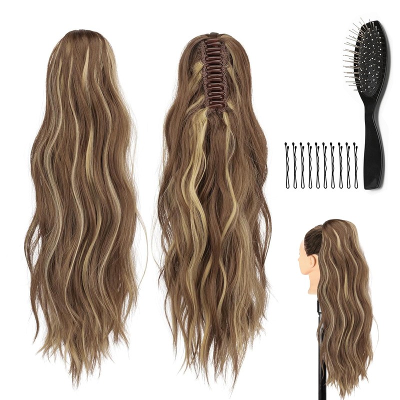 WJMY Wavy Ponytail Extension with Clip, Curly 60 cm Braid Extension Hair Extension, Fluffy and Lightweight, Hairpiece, Synthetic Hair for Women with Comb and Clips (12H29# Mixed Colour, 60 cm)