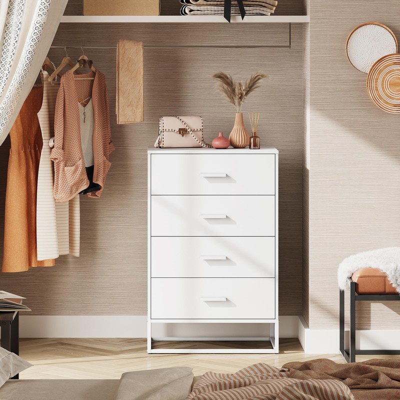 WLIVE White Wood Dresser for Bedroom with 4 Drawers, Tall Chest of Drawers with Sturdy Metal Frame for Living Room, Hallway, Closet