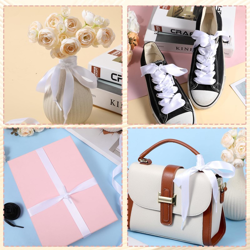 - What you get: you will receive 4 pairs of satin laces for women's trainers. Available in white and black. Each white shoelace is 120 cm long and 2 cm wide. Ribbon laces for shoes fit all kinds of shoes.
