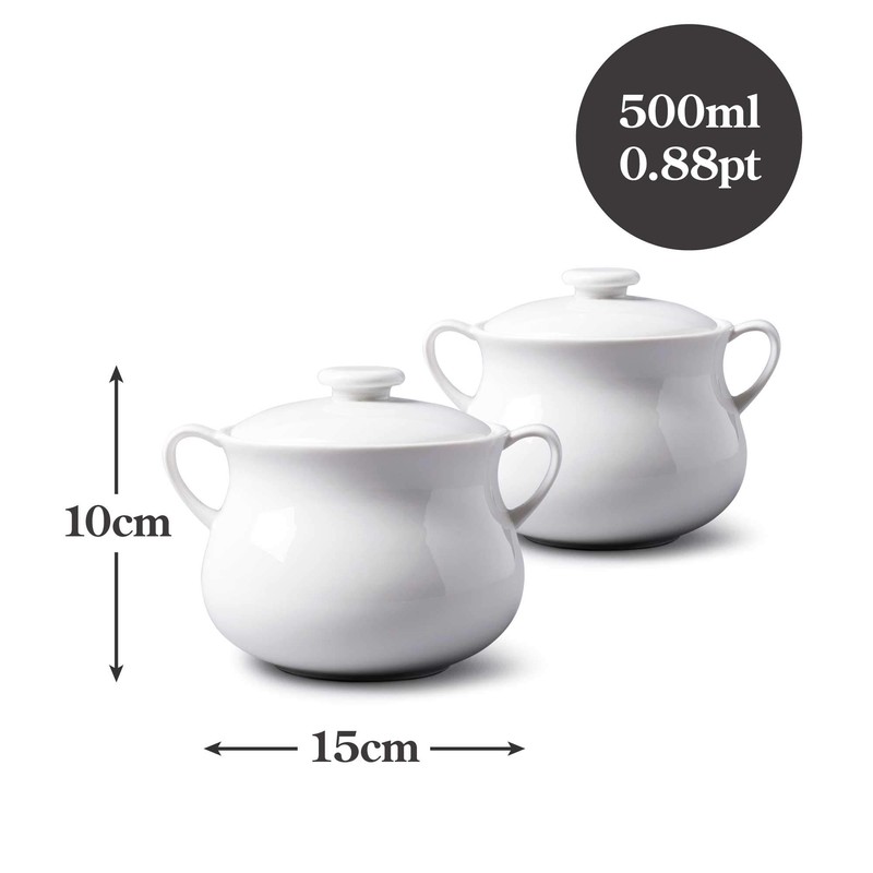 WM Bartleet & Sons 1750 TSET118 Traditional Porcelain Set of 2 Lidded Individual French Onion Soup and Stew Bowl with Handles 500ml – White