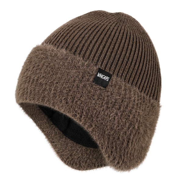 Wmcaps Winter Beanie for Men with Earflaps,Unisex Thick Warm Knit Hat with Ear Flaps,Fleece Lined Woolly Hats for Outdoor Activity-Brown
