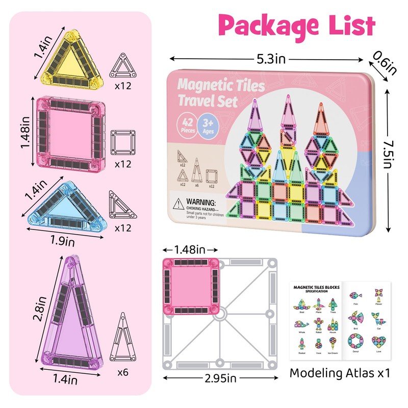 - 【Magnetic Tiles with Travel Case】Mini series magnetic tiles exquisite sets come in different colors and shapes to meet the basic needs of beginners. Featuring 42pc portable travel-size modules. Ignite your child's imagination with our travel-friendly structure block set construction toy. This on-the-go kit is a favorite with toddlers and children of various ages because our magnets support fun S.T.E.M learning at an early age. Foster dreams and nurture your little one's brilliance today!