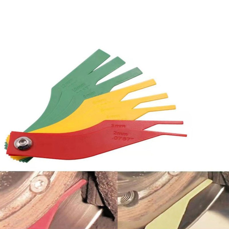 - Each gauge blade has both Metric & SAE: 3 green (12, 10, 8 mm), 3 yellow (6, 5, 4 mm), and 2 red (3, 2 mm).