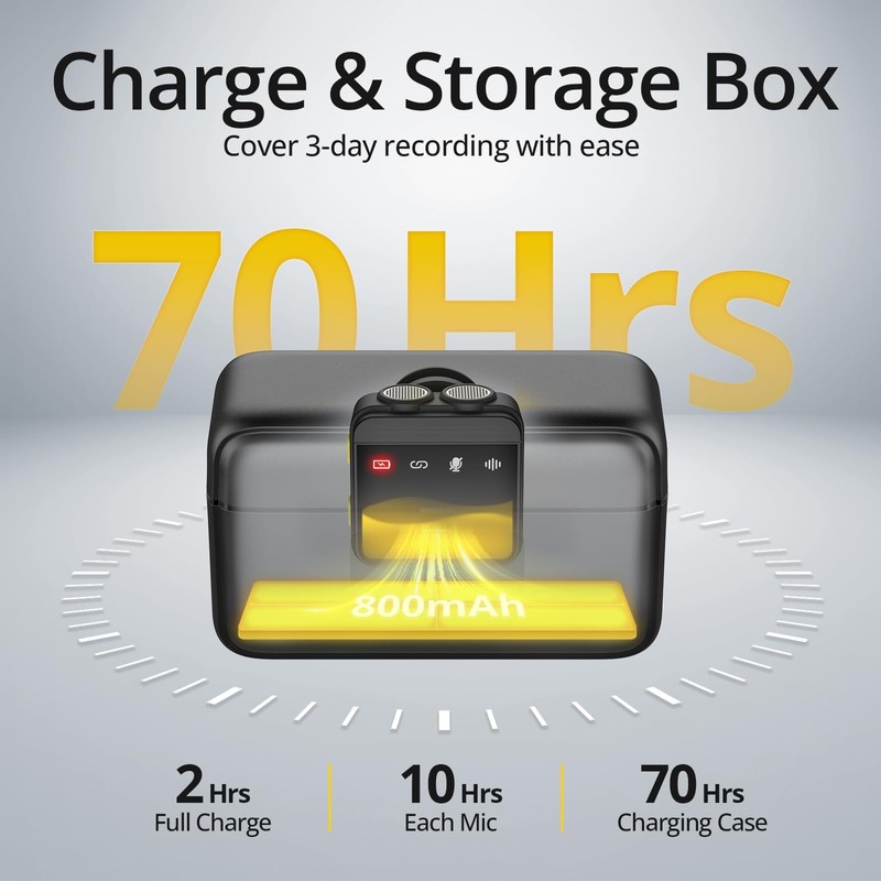 - Magnetic Charging BoxNo more losing stuff by mistake-Stay organized with a portable magnetic charging box! Each mic lasts up to 10 hours, with 70 hours total from the charging case. Charge fully in 2 hours for all-day use of your wireless lavalier microphone.