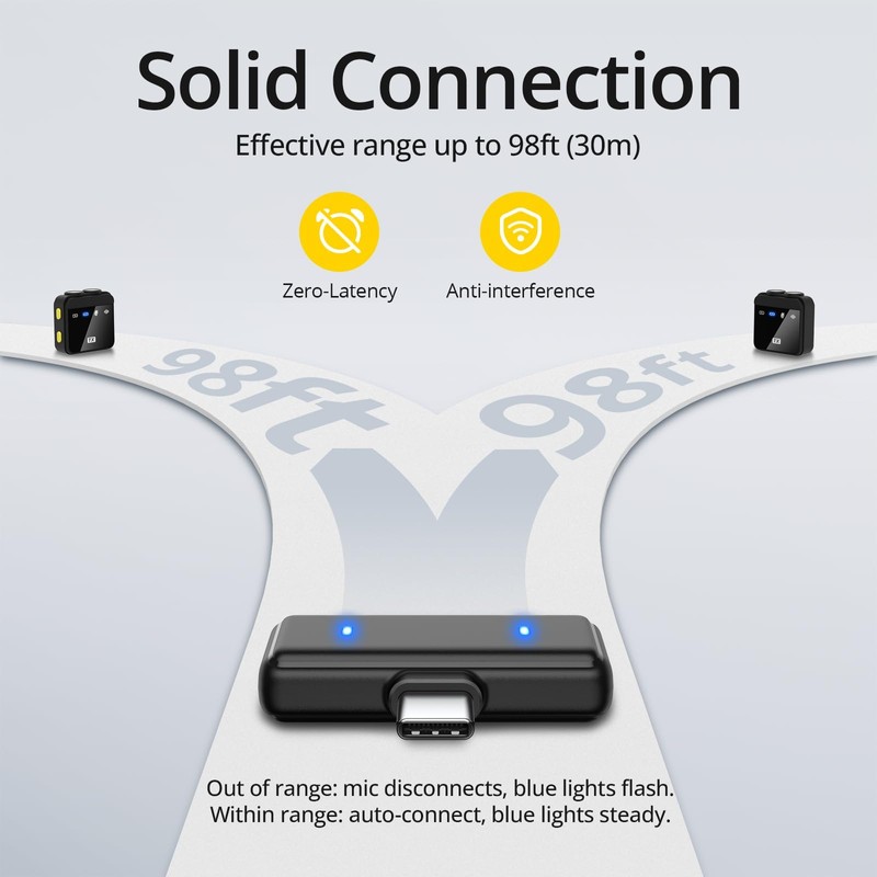 - Stable ConnectionEnjoy uninterrupted recording up to 98 ft (30m) with this wireless lavalier microphone for iPhone, Android (USB-C Port), featuring zero latency and anti-interference technology. Ensure clear, consistent sound capture even from a distance.