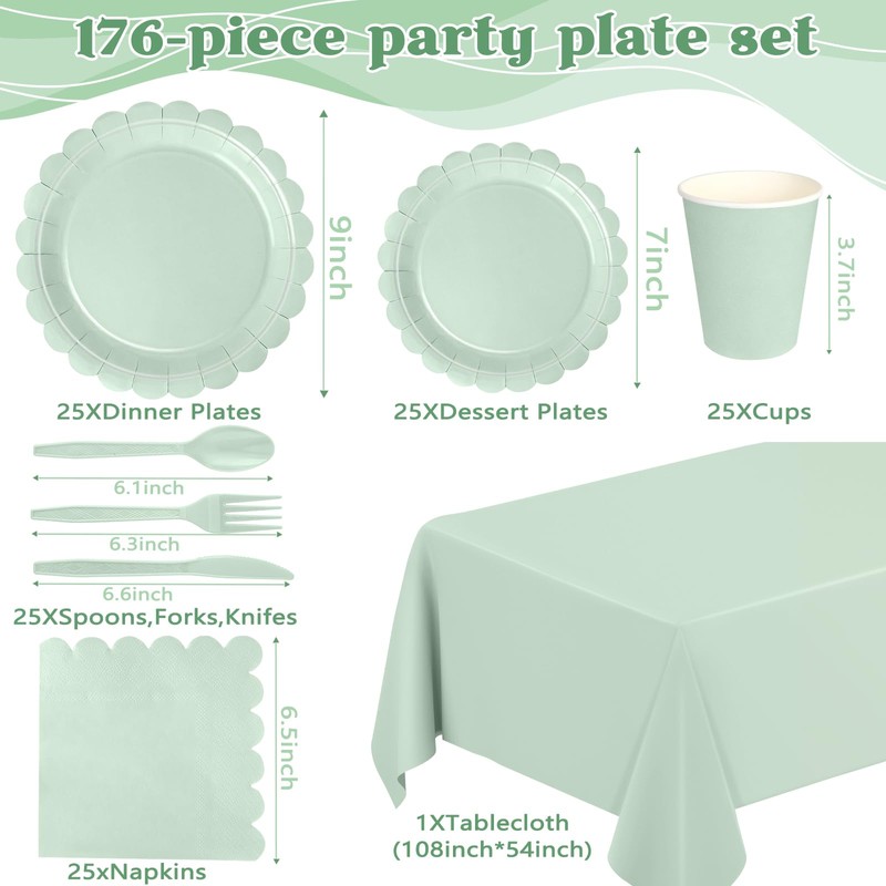 - Value Pack for 25 Guests: This 176-piece sage green party supplies set includes 25 x 9" plates, 25 x 7" luncheon plates, 25 x 9oz paper cups, 25 x 6.5" napkins, and 25 plastic utensils (forks, spoons, knives), all in an elegant sage green color, perfect for serving 25 guests