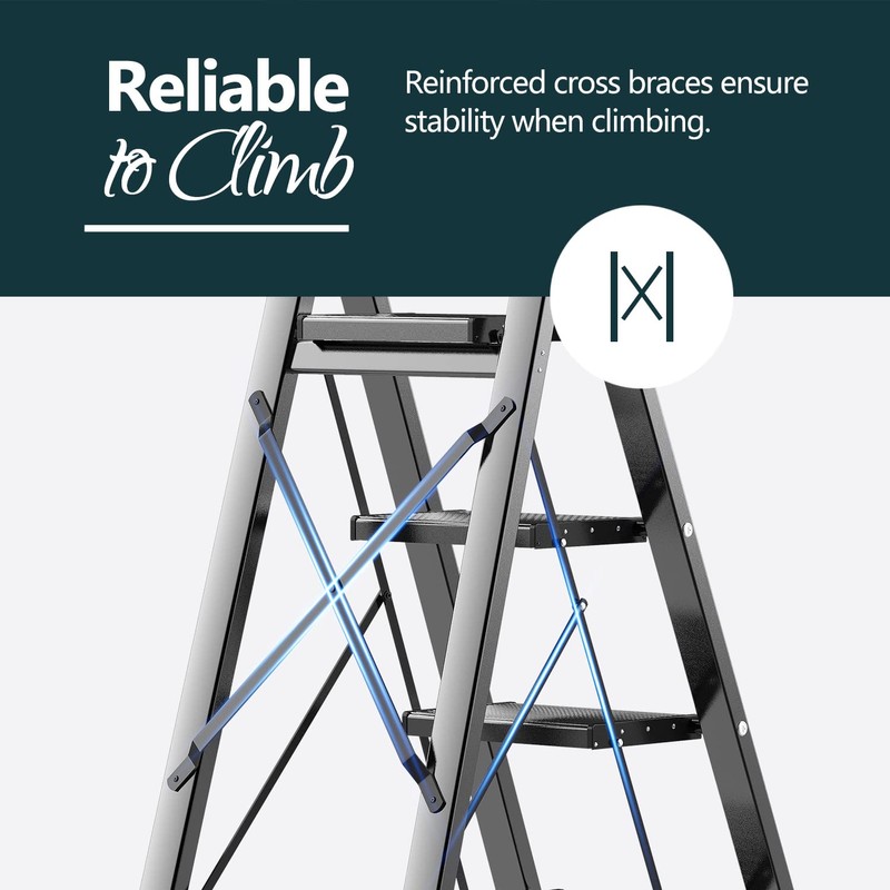 Easy to use - Comes fully assembled. Can be easily opened and folded in secs. The handgrip at the top help keeps balance when climbing. Embedded beams enhance the stability of the ladder, and you can finish your task confidently and comfortably on the ladder.