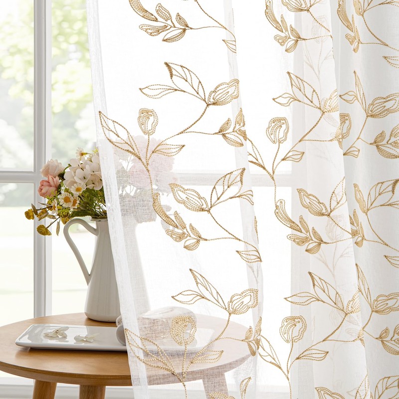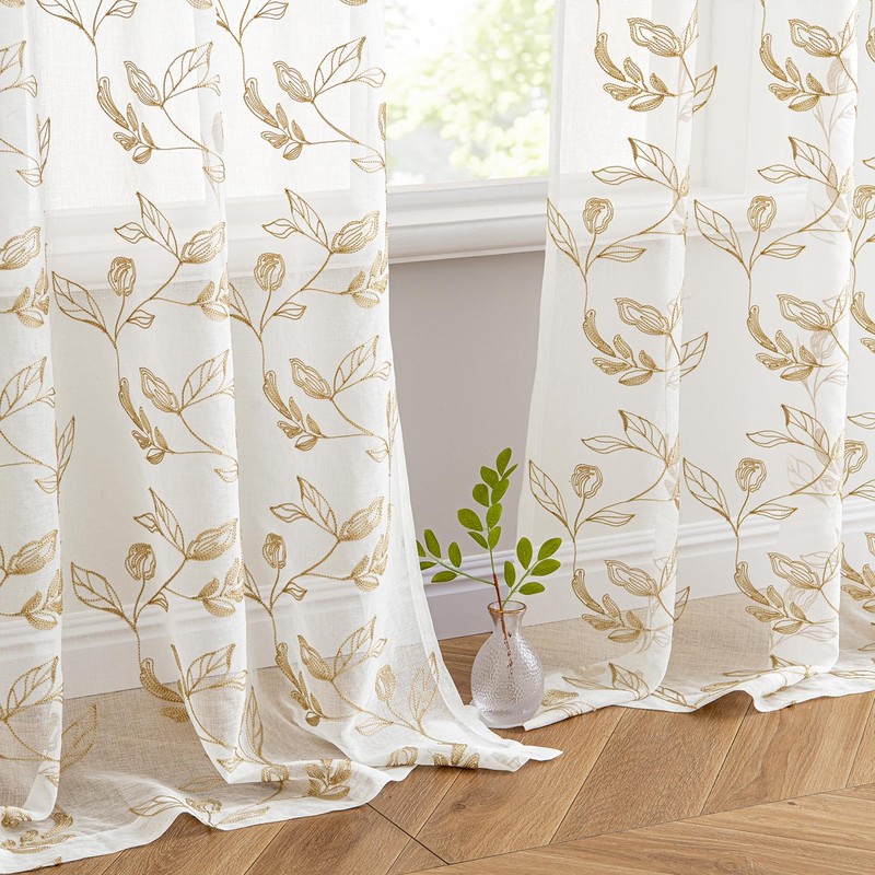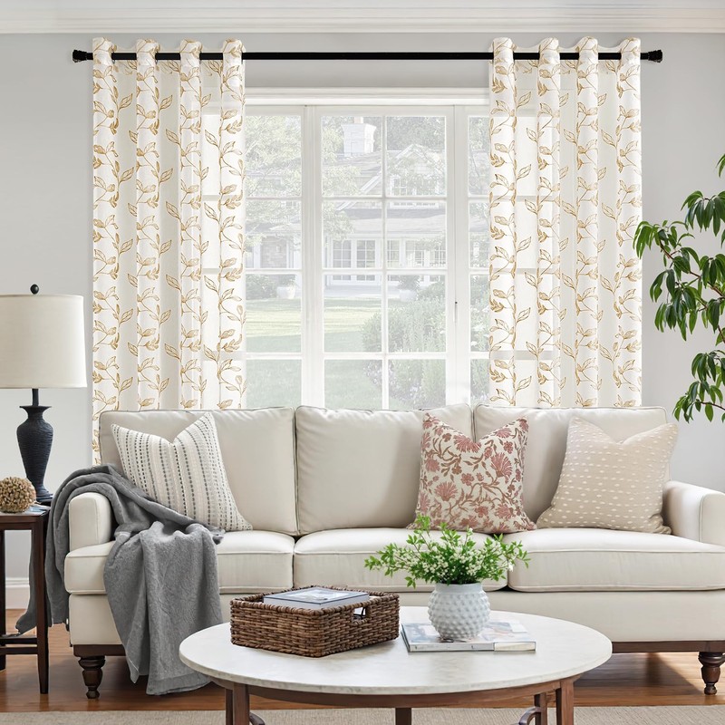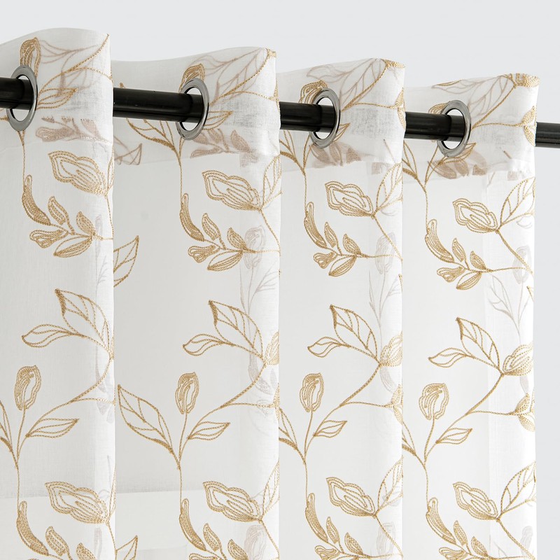 Woaboy Curtains Taupe Leaves Pattern Voile Curtains with Eyelets Living Room Transparent Eyelet Curtain Sheer Voile Curtains for Bedroom Set of 2 140 x 245 cm (W x H)