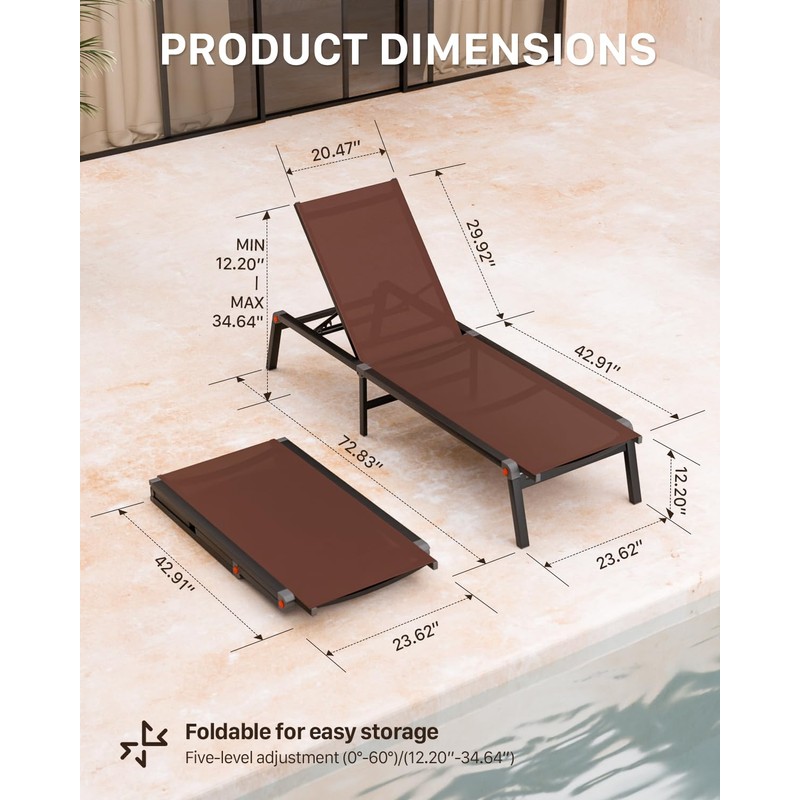 WOAJNQO Aluminum Chaise Foldable Patio Lounge Chair Outdoor,Adjustable 5-Position Recliner Pool Lounge Chair,Full Flat Tanning Chair for Patio,Beach,Pool,Outdoor Lounge Chairs,Brown