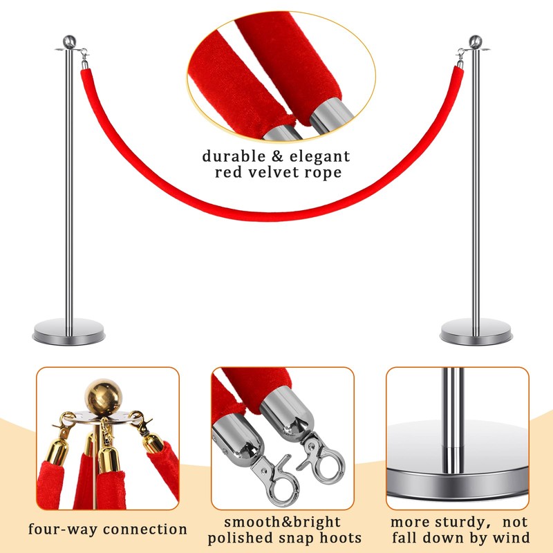 - Nice Combination: you will receive 8 pieces of red velvet ropes, 8 silver poles with 8 stainless steel decorative hollow balls and 8 fixing pieces, 8 silver bases with 8 hangings and 1 non woven red carpet runner; They are nice combinations for you to decorate different kinds of parties and meaningful occasions