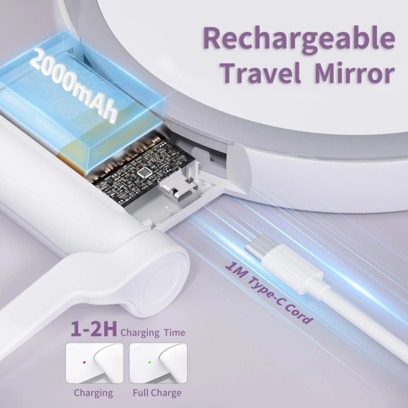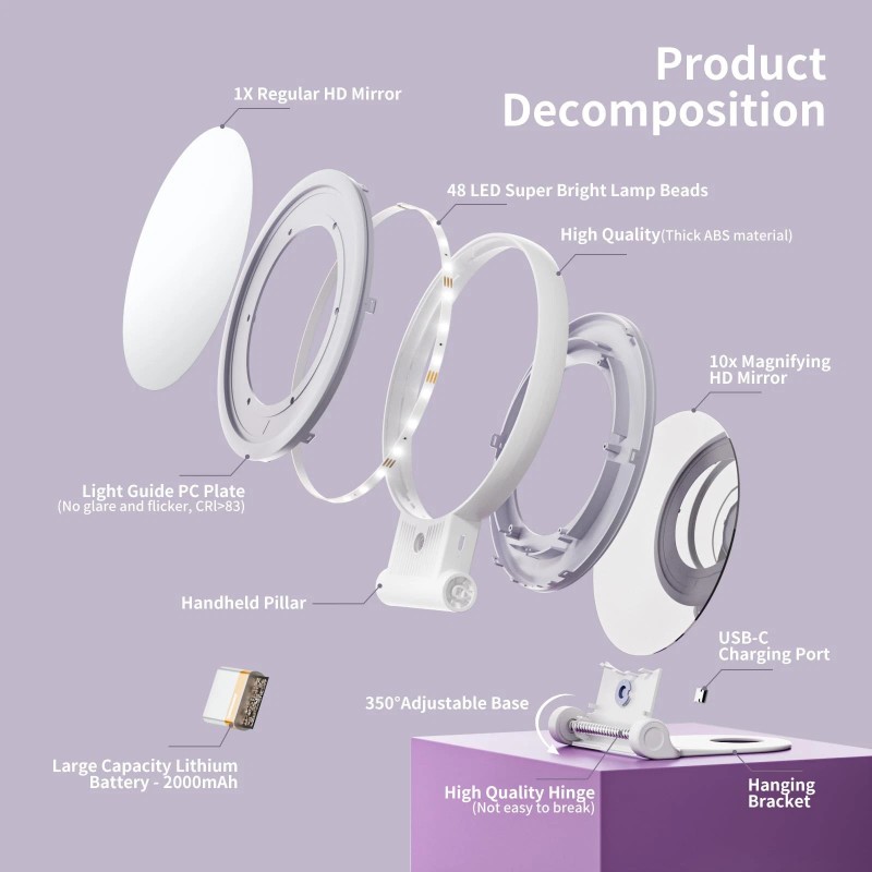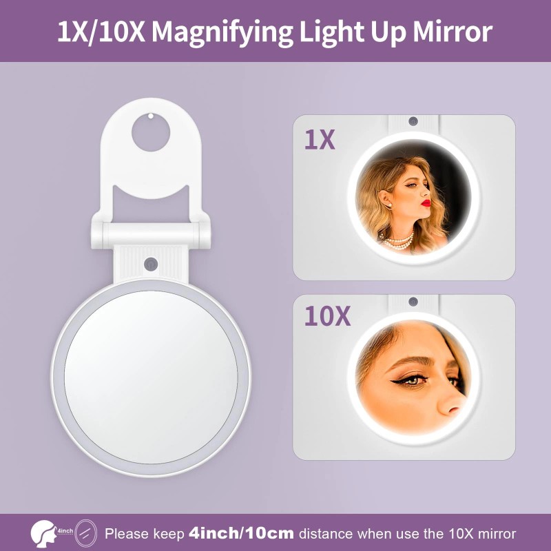 Double Mirror with Light:This two-sided mirror is equipped with 48 lamp beads, soft lighting, one side is a 10x LED magnifying mirror, better magnification of facial details,which is good for makeup needs, shaving, or deep cleaning,and the other side is a high-definition, non-distorted mirror.