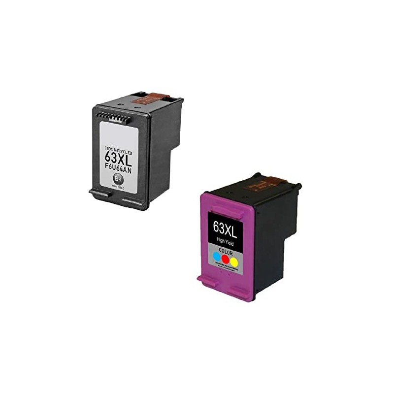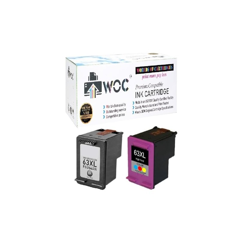 2-Pack WORLDS OF CARTRIDGES Remanufactured Ink Cartridge Replacement for HP 63 / 63XL (F6U61AN / F6U62AN / F6U63AN / F6U64AN) (Jumbo: 100-153% Higher Yield compared to F6U61AN / F6U62AN) (Black + Tri-color). Each product is individually print tested and guaranteed to perform with compatible OEM fax/printer and does not void your fax/printer's warranty. FOR USE IN: HP DeskJet 1110, 1111, 1112, 2130, 2131, 2132, 2133, 2134, 2136, 3630, 3631, 3632, 3633, 3634, 3635, 3636, 3637, 3638 & ENVY 4511, 4512, 4516, 4520, 4522, 4523, 4524, 4526, 4527, 4528 & OfficeJet 3830, 3831, 3832, 3833, 3834, 4650, 4652, 4654, 4655. YIELD: 480 pages (black) 330 pages (color) (@ 5% coverage). WORLDS OF CARTRIDGES products are guaranteed to meet or exceed original OEM products in both print quality and page yield. They are primarily made in ISO 9001/14001 and STMC quality certified factories using the highest quality new and recycled components. WARRANTY: Premium 100% full lifetime guarantee. See WORLDS OF CARTRIDGES profile page for more information.