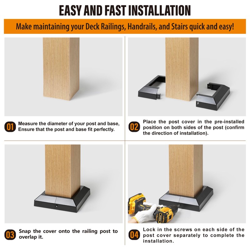 - Quick Installation: Simply snap the Post Skirt into the post, And screw lock the two sides separately to complete the installation (The bottom of the post cover uses a fixing adhesive, Which can better prevent shifting)