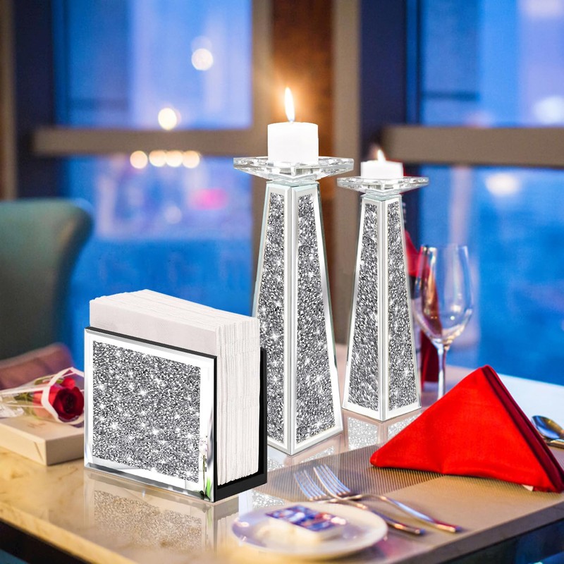 • Soporte para servilletas con espejo: el diseño del servilletero es simple, los dos lados son diamantes, y el espejo de vidrio cubre los diamantes. Sujeta la cantidad de servilletas en el medio sin que se vea desordenado. Muy resistente y bien hecho.