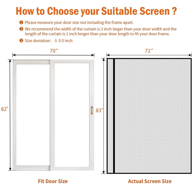 - SCREEN SIZE AND FIT DOOR SIZE - The screen size is 72" width x 83" height, fits your door size 70" x 82". Before ordering, carefully measure your door size (door only, exclude the frame) to ensure proper fit.