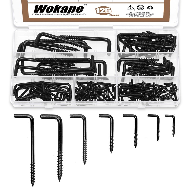 Wokape 125PCS 7 Sizes L-Shaped Screws Hook Kit, M2.4 M2.5 M2.8 M3.4 M3.7 M3.8 M4.7 Self-Tapping Right-Angle Hooks Hanging 7-Shaped Screw-in Hooks Square Bend Hook for Home/Workplace/Office(Black Zinc
