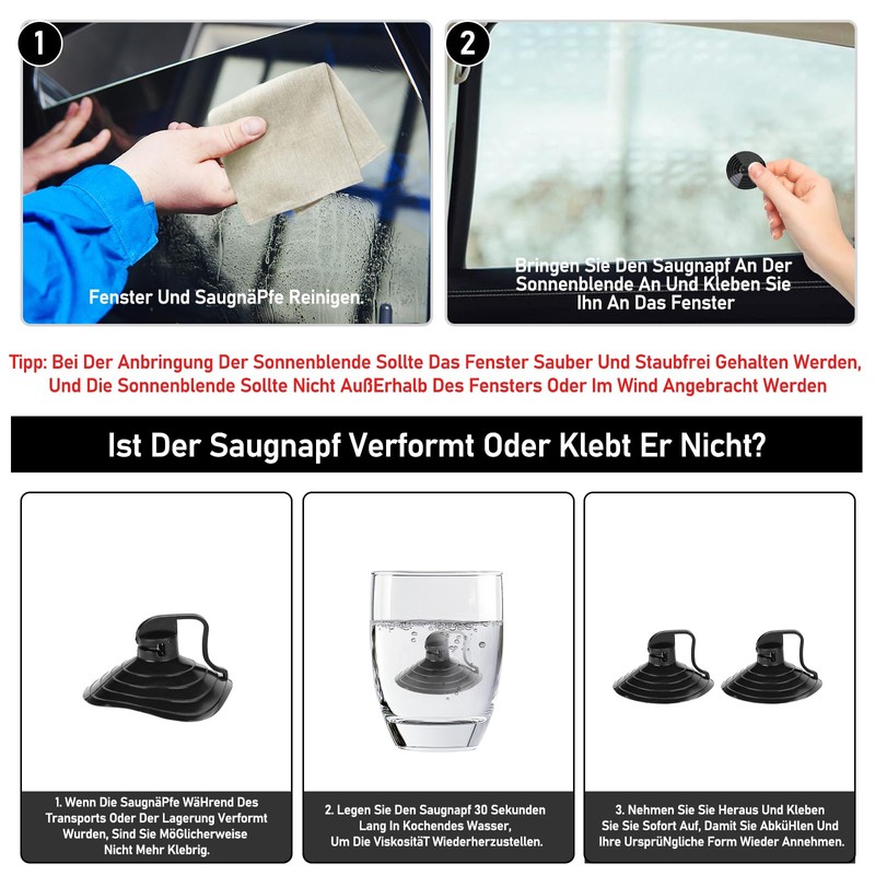 - Stable hold - suction cups for car sun protection - easy to attach and securely fixed. The car window sun shade is attached with strong suction cups for windows and can be removed at any time without leaving any residue. Tip: If the sun protection car suction cup is deformed, simply place it in hot water for 30 seconds - then they will stick perfectly again!