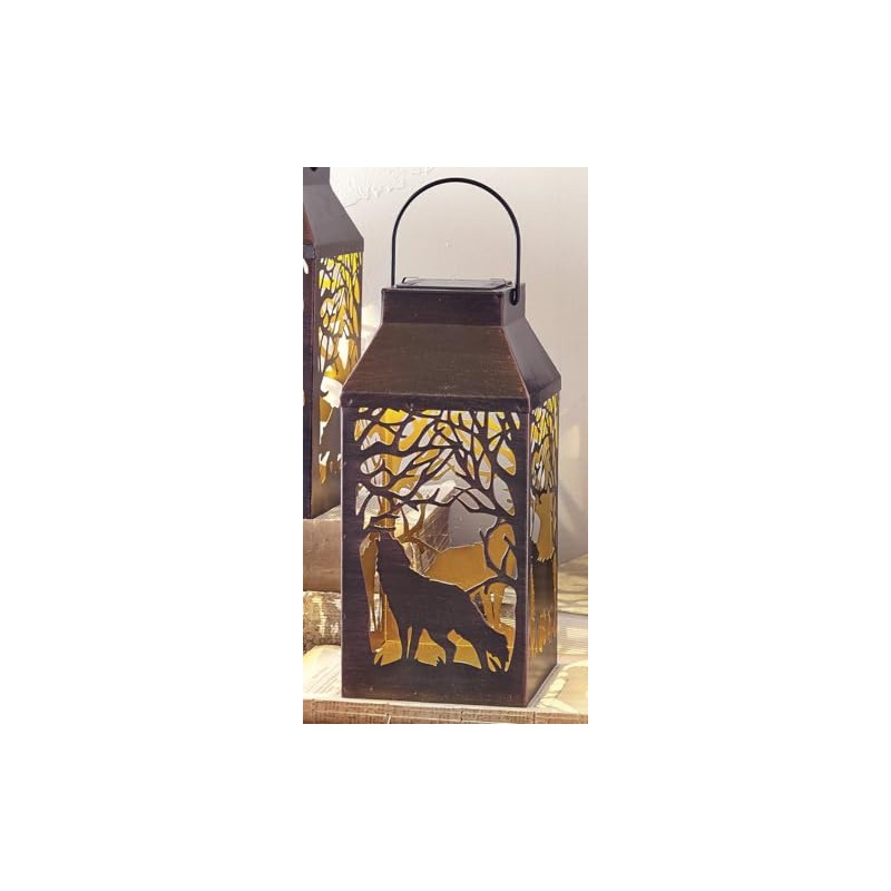 A Black Forest Décor Exclusive - Intricate cutout branches and wolf silhouettes add woodland style and charm to this rustic metal solar lantern. 5 1/2"W x 5 1/2"D x 15 1/2"H.