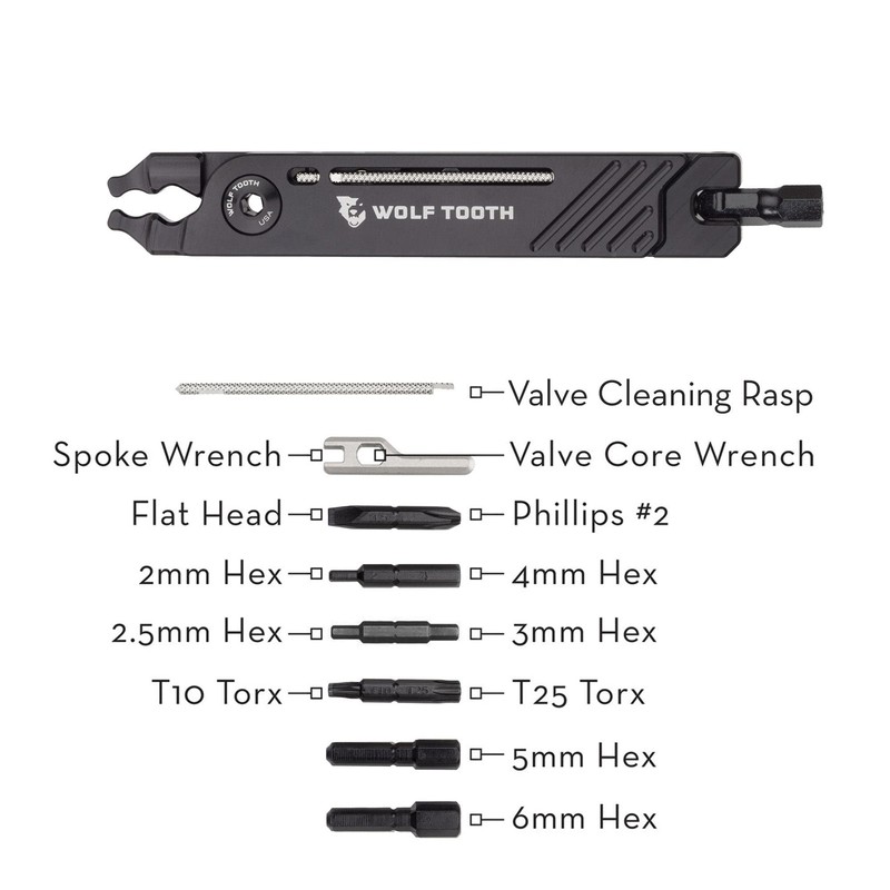 - Pack Pliers Multi Tool with 17 function 8mm hex head has 4mm insert, each with 8 included hex bits. The ball detent swivel head handle also doubles as a breaker bar to help you access to places you can't reach. Spoke Wrench, Valve Core Wrench, Hex Wrench (0.08, 0.1, 0.1, 0.2, 0.1, 0.2, 0.2, 0.2, 0.2, 0.2 inch (2.5, 3, 4, 5, 6, 8 mm) Torx Wrench (T10, T25), Flat Head Slotted Screwdriver (3.5 mm) / Phillips Type Screwdriver (2) / Master Link Attachment of Valve Stem Lock Nut Attachments are stored using magnet. Compatible with 9, 10, 11, and 12 speed master links and chains (not compatible with Campagolo 12 speed chains) Master link storage is compatible with SRAMPowerLockLink, ShimanoQuick-Link, KMCMissingLink, and other similar master links. (Wipperman ConnexLinks) Material: 7075-T6 aluminum handles, CrV tool Steel Swivel Head, S2 Tool Steel Bit; Weight: 2.6 oz (68 g); Size: 5.7 inches (146 mm) (Length x Width x Thickness) 0.8 inches (20 mm) x 0.4 inches