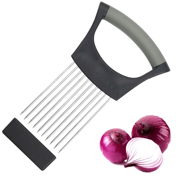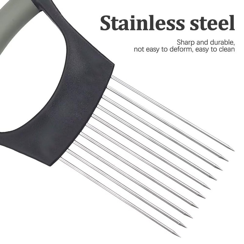 - Sharp design: we have specially developed the onion slicer with 10 stainless steel forks (7 cm x 5 cm) under the handle (width 9.5 cm). They always stay super sharp and effortlessly cut tomatoes, potatoes, carrots, lemons, pineapples and other fruits and vegetables, making your cooking experience more efficient and convenient.