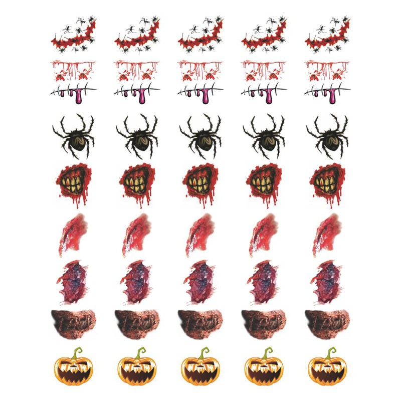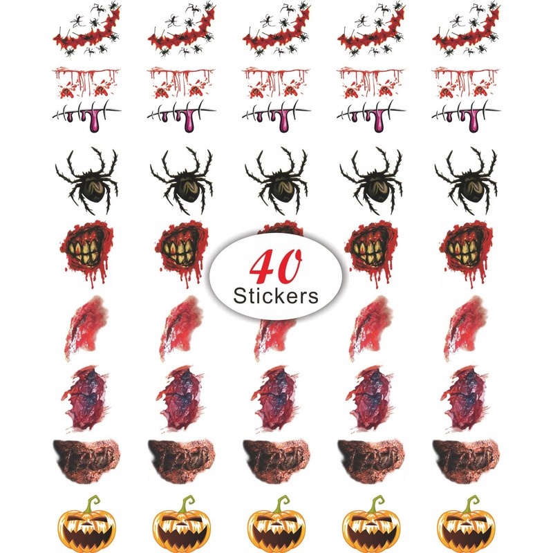 - Package: a set of 40 sheets, each size of 2.4 * 2.2 inches (60 * 55mm), Each set has 8 different designs, such as scars, spiders, blood stains, pumpkin lanterns etc, which can be used by multiple people, You can also give it to your relatives and friends