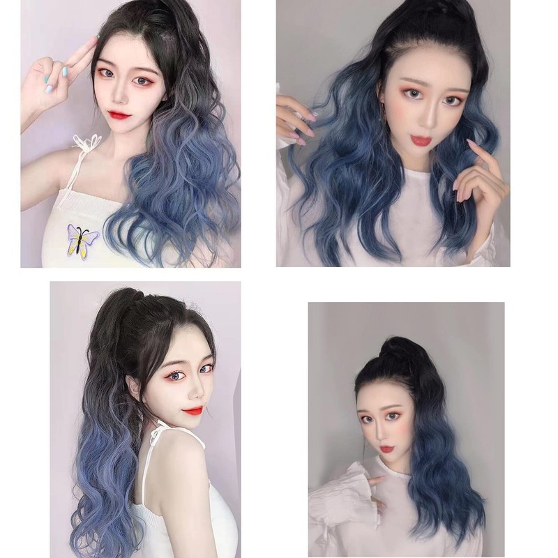 Women's Bowknot Ponytail Wig Long Curly Hair Extensions Point Wig Wavy (Blue, 55cm)
