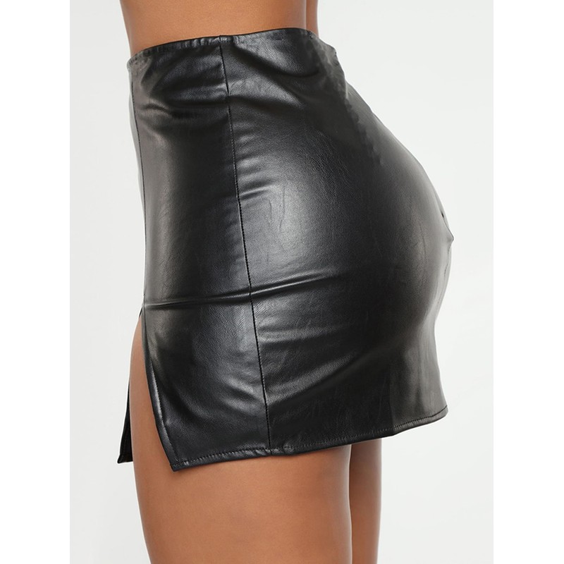 - Leather Skirts for Women featuring a high waist, solid color, split hem, zipper, elastic closure, pencil style, package hip design, mini length