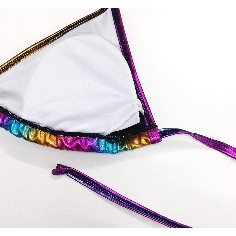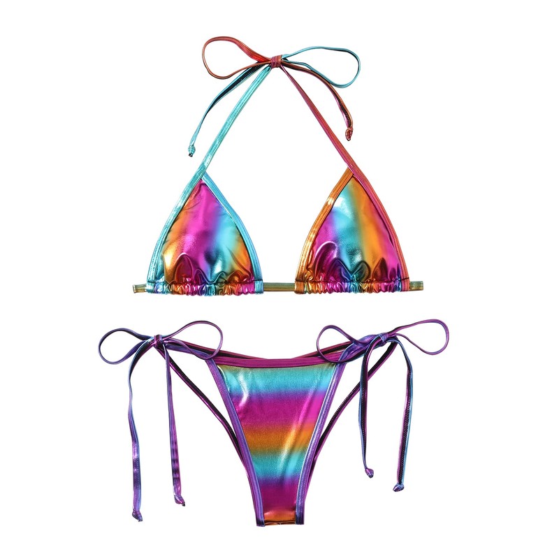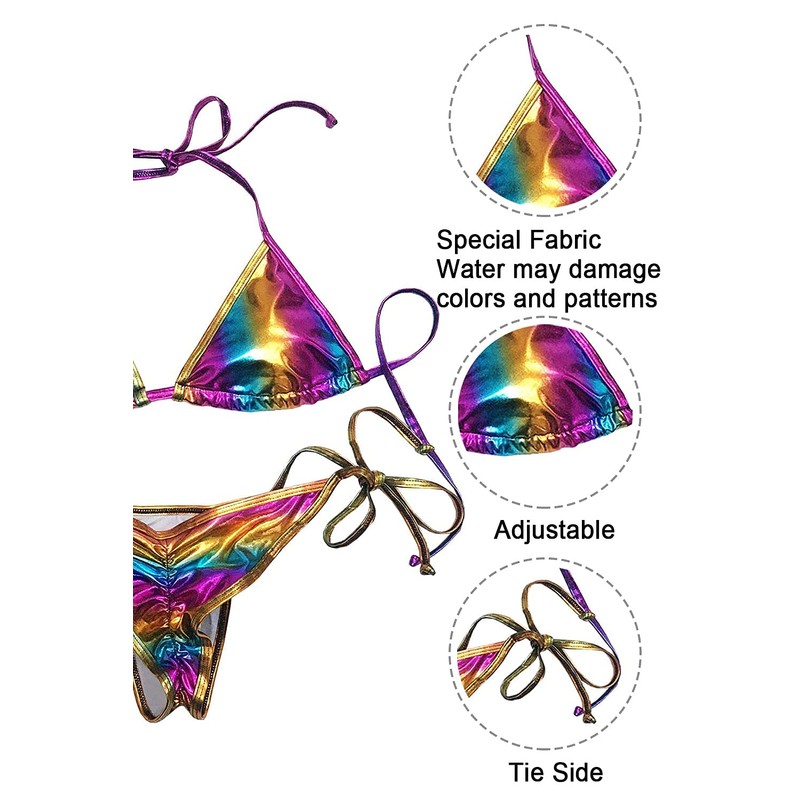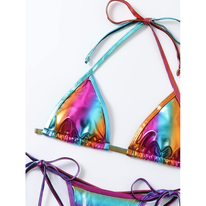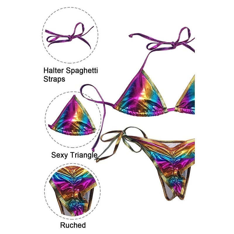 Women's Liquid Metallic Rainbow Bikini Sets Shiny String Padded Triangle 2 Pieces Swimsuit Set