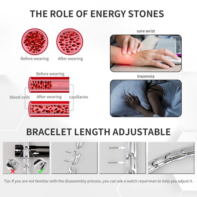 - 🍒【Adjustable size】Magnetic bracelet length: 200mm; width: 8mm; thickness: 2.5mm; the bracelet comes with a size adjustment tool, so you can easily adjust the size at home according to your wrist (if you can't adjust the size by yourself, ask a professional to do so).