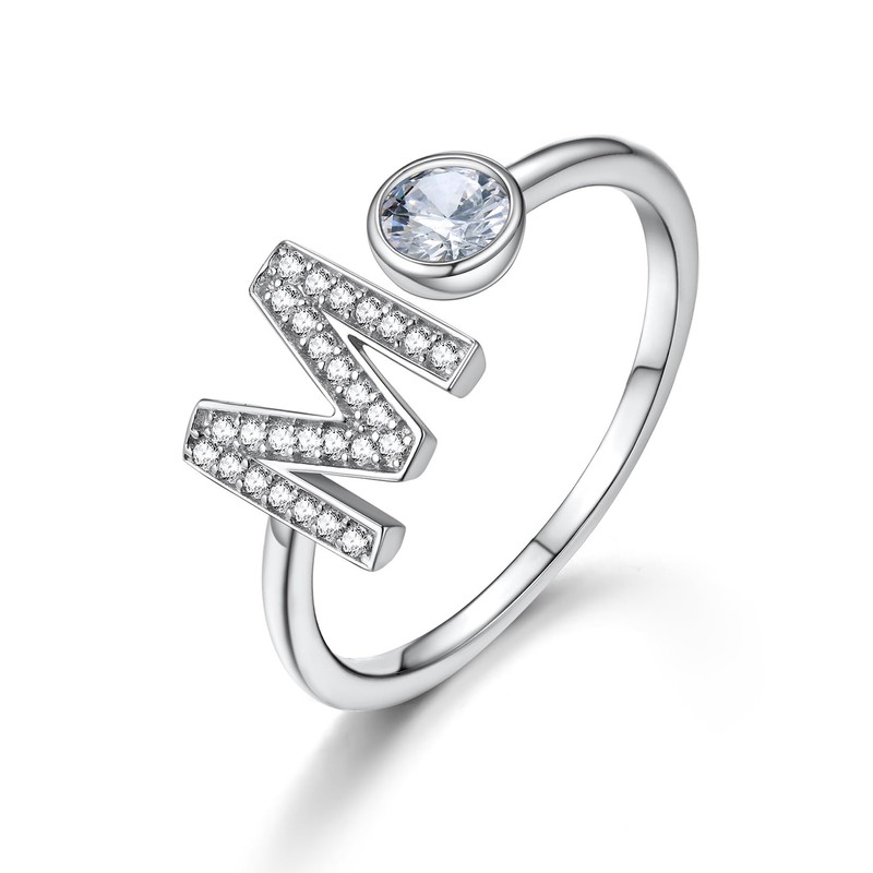 Women's Open Ring with Initial M, Crystal M Silver Letter Adjustable Stackable Ring With Gift Box