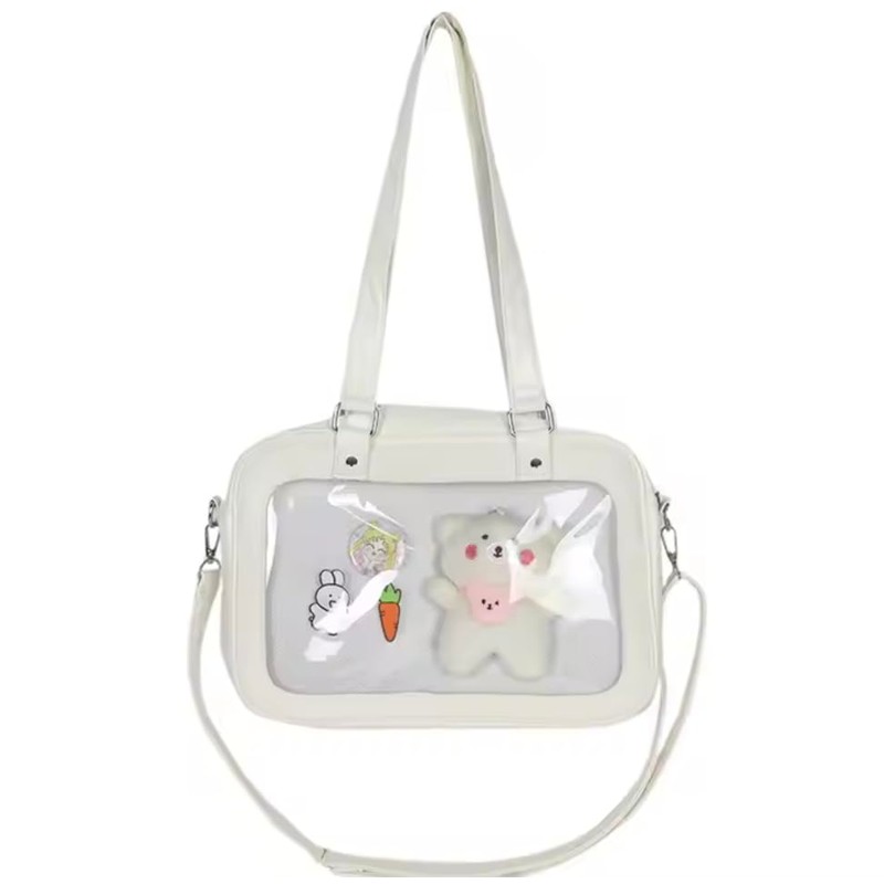 Women's Spacious Kawaii White Crossbody Ita Bag with Mesh Pin Insert, Clear Front Pocket, and Adjustable Strap – Stylish PU Leather Purse Dual Handle with Removable Strap, Shoulder Bag