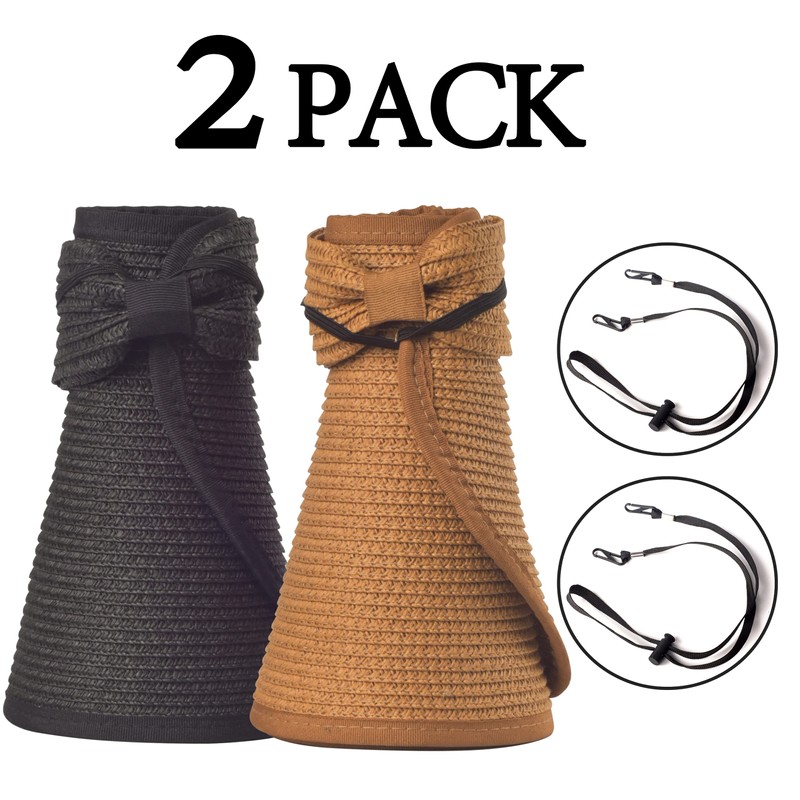 Women Sun Visors Foldable Straw Hats Summer Beach Packable Hat Floppy Wide Brim Cap Big Heads Sombrero (Black+Khaki)