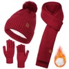 Womens Beanie Hat Scarf Gloves Set, Fleece Lined Warm Winter Hat with Pom Pom, Long Knit Scarf 3 in 1 Set for Cold Weather