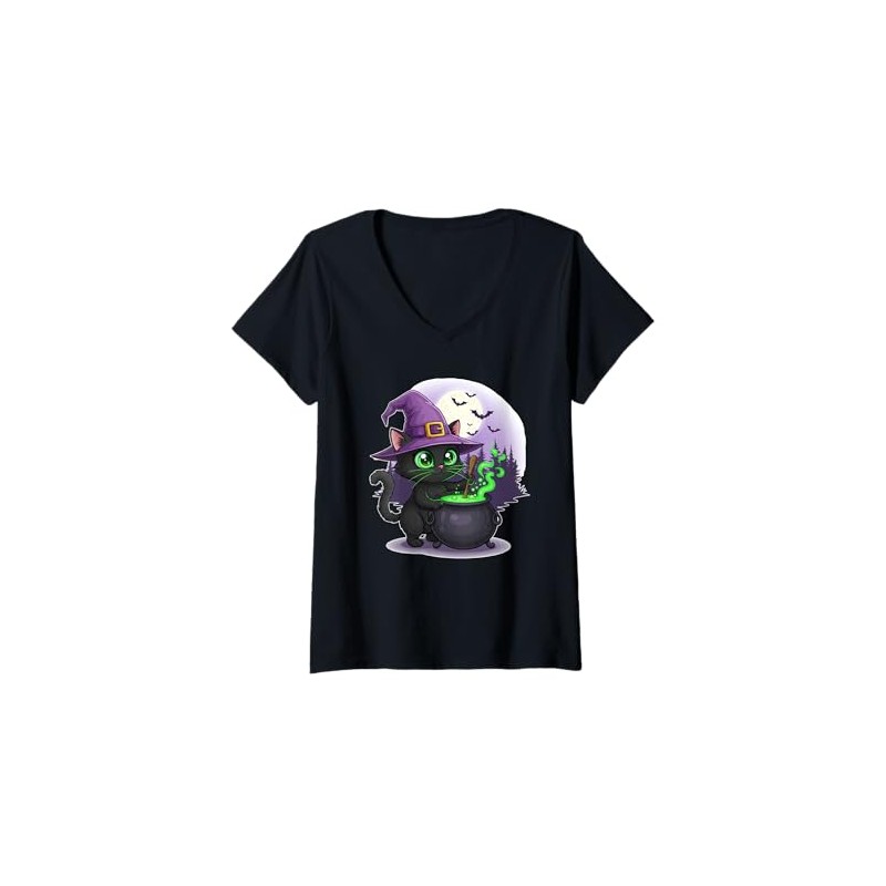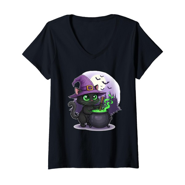 Womens Black Cat Witch with Cauldron and Moon V-Neck T-Shirt
