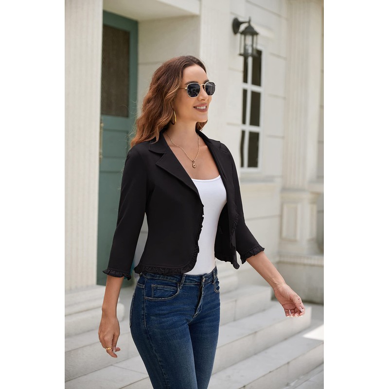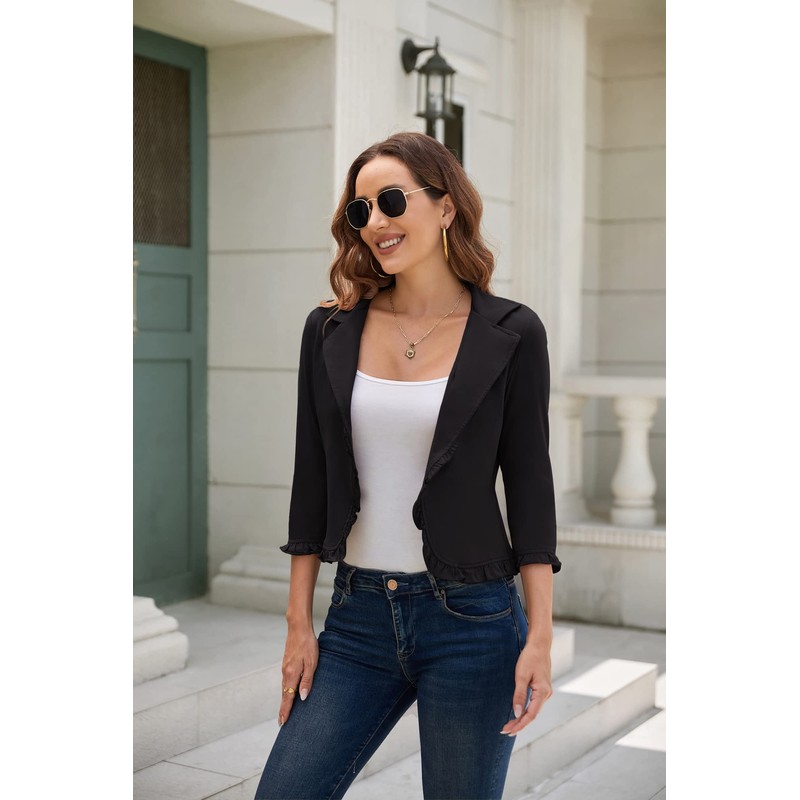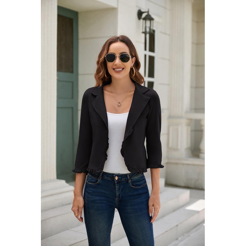 - Open front cropped blazer, lightweight, 3/4 sleeve, cute for casual and work