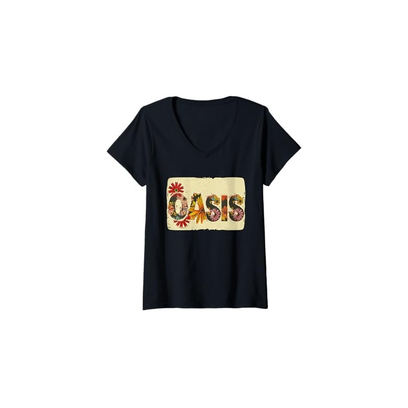 Womens Colorful Oasis Statement with Flowers V-Neck T-Shirt
