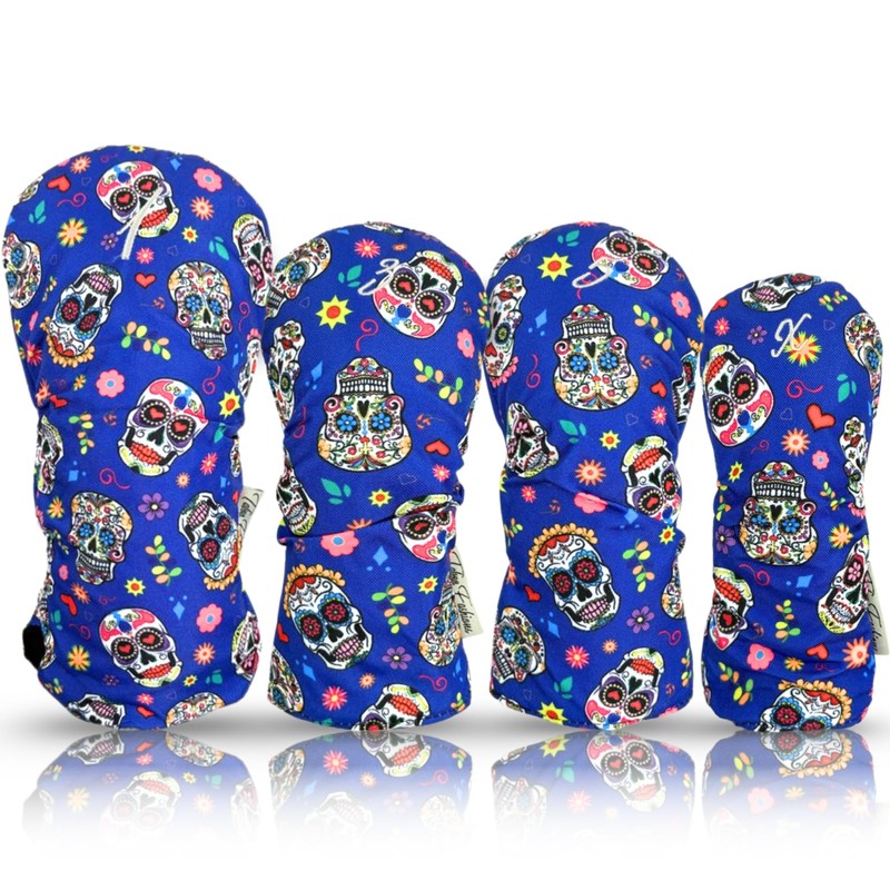 Womens Designer Resort Golf Club Covers 4 Pack - Taboo Fashions Numbered Head Covers for Driver Woods & Hybrid - Weather/Moisture Resistant Protection (Blue Sugar Skulls)
